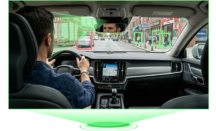 Yolda karşılaşılabilecek tehlikeleri önceden algılar. Önden çarpışma riski, şerit ihlali veya takip mesafesinin korunmaması gibi durumlarda araç içi sesli uyarılar devreye girer, bu teknoloji, sürücü reflekslerini hızlandırarak yol güvenliğini en üst seviyeye taşır.